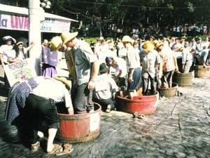 Segundo ele, o modelo trazido para Videira é o que representa a cultura ancestral da fabricação do vinho, ou seja, um determinado número de equipes concorrendo entre si para saber quem consegue esmagar com os pés o maior número de uvas e, por conseqüência, originar o maior volume de “vinho”, que na verdade trata-se do líquido originado pelo processo de esmagamento da uva no local da competição.