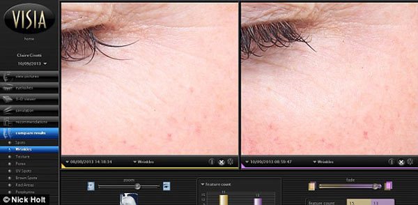Antes de iniciar o teste de 4 semanas minha pele foi testada por Nicolas Miedzianowski-Sinclair, da The Cosmetic Imaging Studio – que fornece imagens em 3D para pessoas que passam por procedimentos cosméticos, utilizando uma máquina Visia para digitalizar meu rosto. Ele, então, fez novo teste no final da minha experiência.